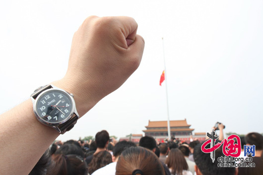 ![]() 2008年 5月 19日 14時 28分 的 天 安 門 廣 場 站 滿 悲 痛 的 人 群 , 大 家 自 發 聚 集 在 這 裡 。 |