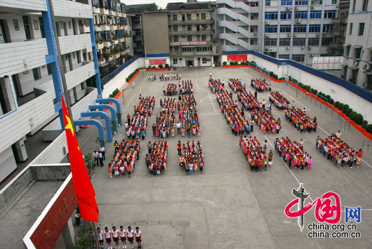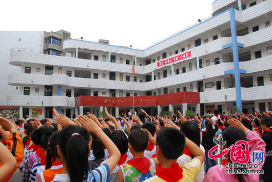 ![]() 5月 19日 早 晨 , 四 川 省 金 堂 縣 實 驗 小 學 校 的 師 生 正 在 升 旗 儀 式 上 , 少 先 隊 員 們 向 降 半 旗 的 五 星 紅 旗 敬 禮 。 楊 恆 / 攝