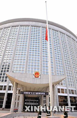 ![]() 5月 19日 , 中 國 外 交 部 下 半 旗 志 哀 。 為 表 達 全 國 各 族 人 民 對 四 川 汶 川 大 地 震 遇 難 同 胞 的 深 切 哀 悼 , 國 務 院 決 定 , 2008年 5月 19日 至 21日 為 全 國 哀 悼 日 。 新 華 社 記 者 羅 曉 光 攝
