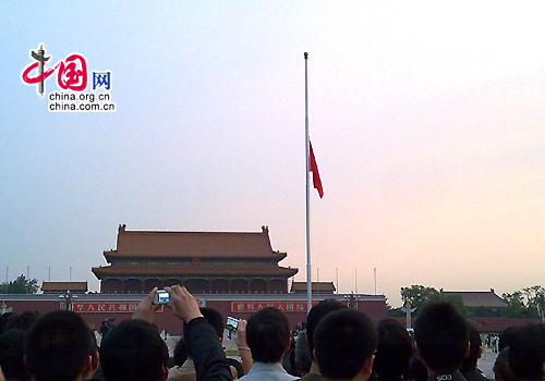 ![]() 5月 19日 4時 58分 , 北 京 天 安 門 廣 場 在 正 常 的 升 旗 儀 式 後 下 半 旗 , 以 表 達 全 國 各 族 人 民 對 四 川 汶 川 大 地 震 遇 難 同 胞 的 深 切 哀 悼 。 中 國 網 / 朱 穎 攝