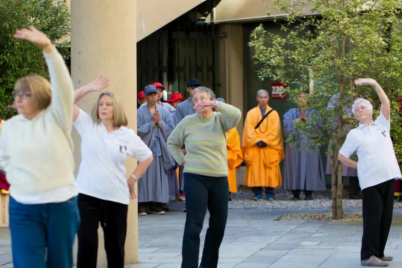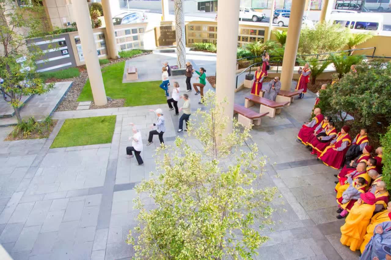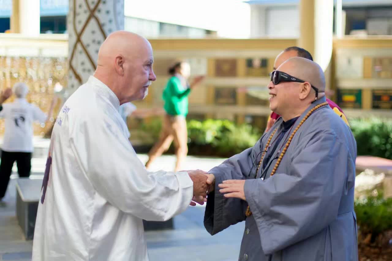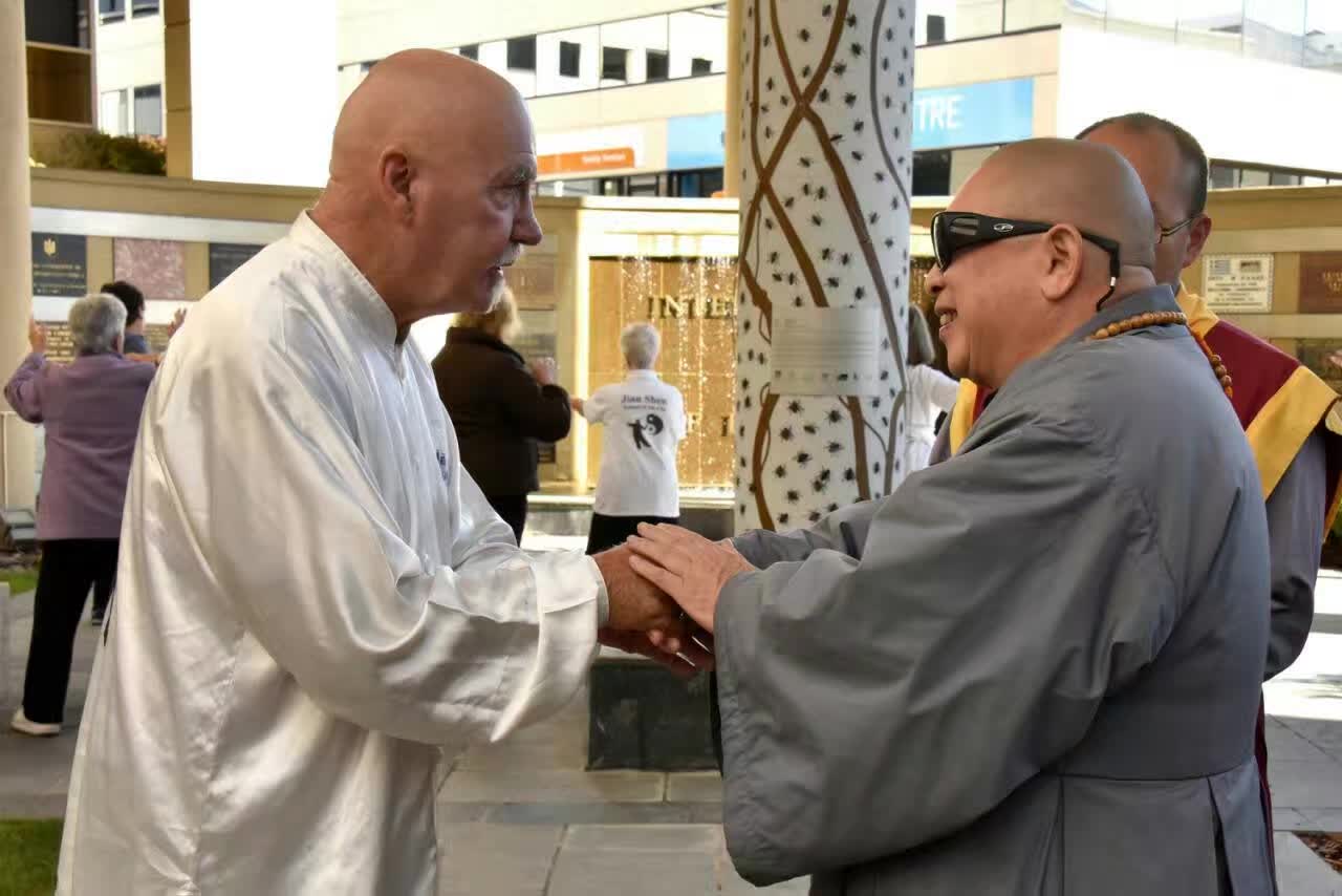 應 塔 州 霍 巴 特 本 地 的 太 極 健 身 學 校 的 Bill Pearson 先 生 邀 請 , 薄 伽 梵 智 及 維 摩 詰 宗 師 率 澳 大 利 亞 塔 州 中 國 佛 教 學 院 的 聖 密 長 老 、 聖 密 上 師 、 聖 密 行 者 、 聖 密 轉 世 者 代 表 , 出 席 於 2017 年 4 月 29 日 星 期 六 上 午 舉 行 的 〝 世 界 太 極 日 〞 活 動 。 每 年 四 月 的 最 後 一 個 星 期 六 , 被 認 定 為 〝 世 界 太 極 日 〞 。 全 世 界 逾 一 百 個 城 市 和 八 十 個 國 家 的 不 同 民 族 、 不 同 膚 色 、 不 同 年 歲 、 不 同 信 仰 的 人 們 , 為 提 倡 健 康 的 生 活 方 式 、 推 廣 精 神 靈 性 生 命 的 平 衡 和 諧 , 而 團 結 一 致 , 聚 首 一 堂 。 今 年 的 〝 世 界 太 極 日 〞 的 主 題 是 〝 同 一 世 界 ── 同 一 呼 吸 〞 。 屬 塔 州 霍 巴 特 地 區 的 活 動 , 在 塔 州 移 民 局 大 樓 外 的 國 際 友 誼 牆 花 園 舉 行 。 Bill Pearson 先 生 邀 請 了 霍 巴 特 不 同 流 派 的 太 極 導 師 , 為 學 員 和 對 太 極 有 興 趣 的 人 士 予 以 指 導 , 大 家 彼 此 交 流 , 共 同 切 磋 , 相 互 學 習 , 教 學 相 長 。 塔 州 孟 冬 的 暖 陽 灑 落 在 廣 場 上 , 微 風 悠 悠 , 落 葉 翩 翩 , 鳥 語 鶯 鶯 , 國 際 友 誼 牆 噴 泉 水 聲 潺 潺 , 學 員 們 平 穩 深 沉 地 呼 吸 , 時 而 大 步 流 星 , 時 而 步 履 安 詳 , 無 論 男 女 老 幼 , 練 習 太 極 的 認 真 、 虔 誠 、 熾 熱 之 心 , 躍 然 於 一 舉 一 動 之 間 。 天 地 融 和 , 動 靜 結 合 , 陰 陽 互 補 , 張 弛 得 宜 。 〝 君 子 之 道 , 與 天 地 和 其 德 , 與 日 月 合 其 明 , 與 四 時 合 其 序 , 與 鬼 神 合 其 吉 凶 〞 。 無 處 不 在 的 太 極 為 古 老 中 華 文 明 所 用 , 從 初 創 發 展 到 今 天 , 從 代 代 秘 密 世 襲 相 承 到 公 開 廣 泛 傳 授 , 風 靡 世 界 , 被 越 來 越 多 的 民 族 和 人 民 認 識 和 喜 愛 , 成 為 人 類 社 會 共 同 的 精 神 財 富 和 社 會 文 明 進 步 的 象 徵 。 四 位 金 剛 永 誠 轉 世 者 應 Bill Pearson 先 生 和 學 員 們 的 請 求 , 即 席 演 示 動 禪 陀 羅 尼 《 佛 是 大 醫 王 》 道 歌 身 印 。 作 為 中 國 傳 統 靈 性 文 化 的 重 要 載 體 , 宗 下 非 物 質 文 化 遺 產 的 聖 密 動 禪 陀 羅 尼 , 以 保 護 眾 生 不 受 傷 的 極 終 善 性 的 慈 悲 和 智 慧 為 內 核 , 以 宇 宙 萬 物 回 歸 超 越 界 靈 性 的 規 律 , 作 為 慈 悲 而 智 慧 的 基 礎 法 則 , 以 古 梵 密 法 融 攝 武 理 而 回 溯 宇 宙 能 量 , 展 現 其 柔 中 寓 剛 、 剛 中 寓 柔 、 柔 中 寓 柔 、 柔 柔 真 剛 的 獨 特 運 動 風 格 。 陀 羅 尼 身 印 聖 舞 矯 健 , 伴 隨 聖 密 道 歌 聲 聲 , 聖 密 形 相 重 重 , 渡 眾 大 戲 上 演 如 如 , 令 在 場 的 眾 生 無 聲 無 色 之 中 , 密 受 聖 密 醍 醐 , 融 入 薄 伽 梵 智 及 維 摩 詰 宗 師 普 施 的 聖 密 十 法 界 曼 荼 羅 之 中 , 親 因 親 果 , 體 證 七 千 四 百 萬 億 靈 子 、 光 子 、 氣 量 子 , 實 踐 人 與 宇 宙 是 一 個 不 連 續 的 整 體 , 領 悟 空 性 永 恆 。 臨 別 前 , Bill Pearson 先 生 與 薄 伽 梵 智 及 維 摩 詰 宗 師 再 敘 友 情 , 並 再 三 感 謝 薄 伽 梵 智 及 維 摩 詰 宗 師 和 澳 大 利 亞 塔 州 中 國 佛 教 學 院 的 支 持 。