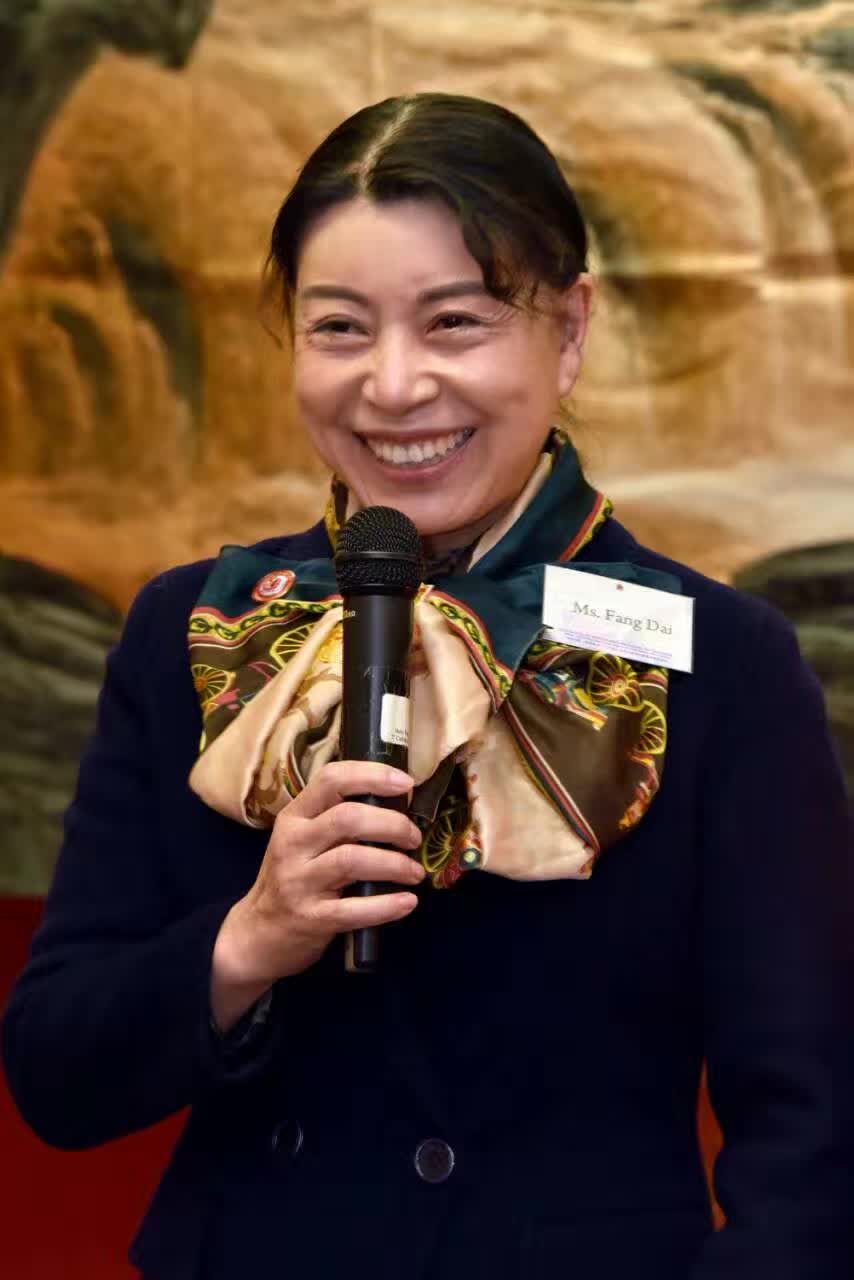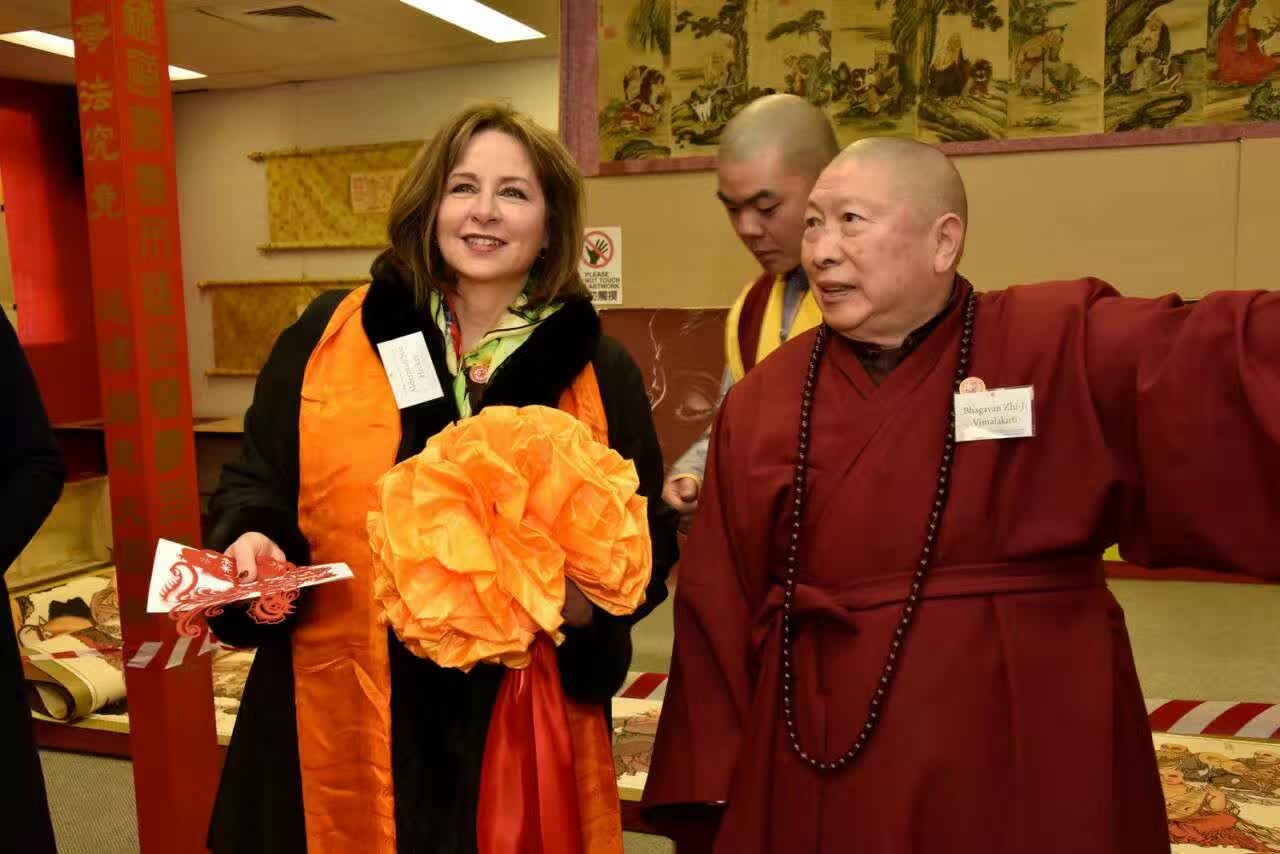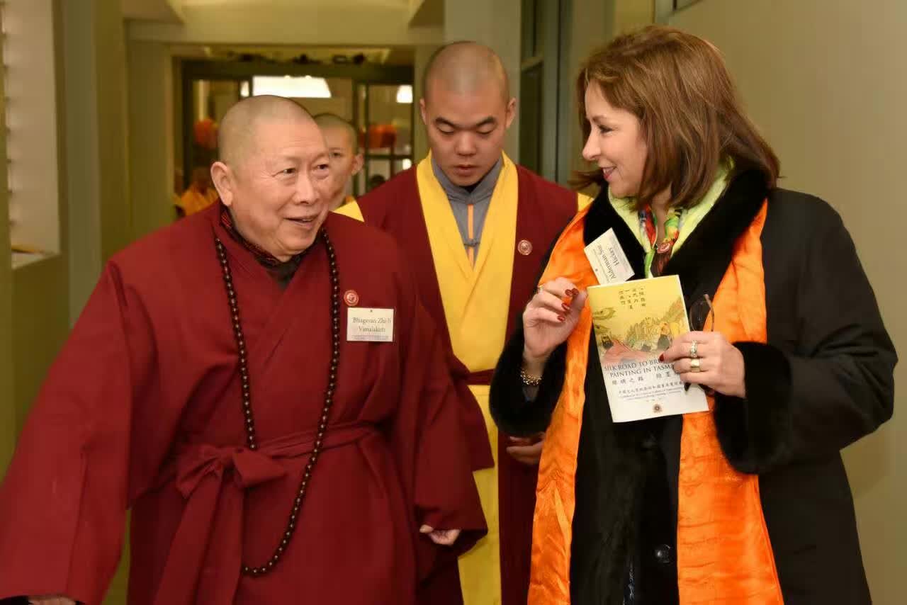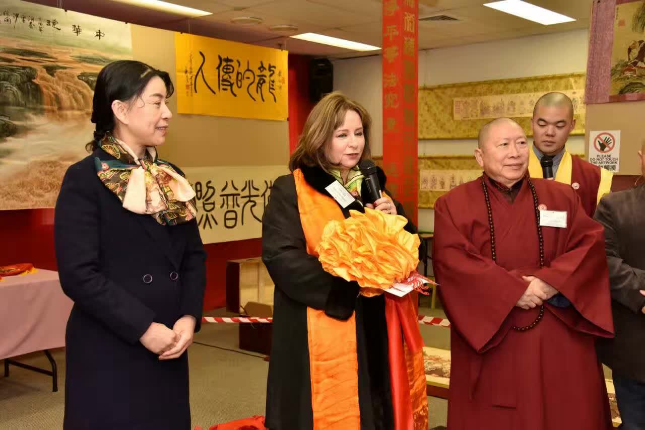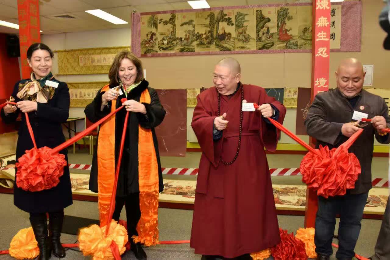 圖 二 , 市 長 、 神 剪 戴 舫 、 薄 伽 梵 智 及 維 摩 詰 宗 師 在 剪 綵 聖 議 進 行 中 。 背 後 空 中 是 唐 吳 道 子 的 羅 漢 圖 。 背 後 地 上 是 百 米 長 卷 剪 紙 《 五 百 羅 漢 圖 》 。 背 後 遠 處 是 《 法 界 源 流 圖 》 。
