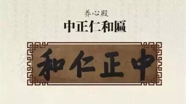 養 心 殿 中 的 「 中 正 仁 和 」 匾 正 是 雍 正 所 書 , 是 說 帝 王 要 中 庸 正 直 , 仁 愛 和 諧 。 是 帝 王 對 自 身 行 為 準 則 的 高 要 求 。