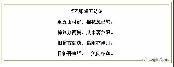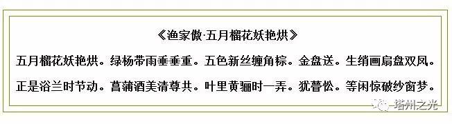 意 思 是 說 , 端 午 節 到 了 , 火 紅 的 石 榴 花 開 滿 山 村 。 詩 人 吃 了 兩 角 的 粽 子 , 高 冠 上 插 著 艾 枝 。 又 忙 著 儲 藥 、 配 藥 方 , 為 的 是 這 一 年 能 平 安 無 病 。 忙 完 了 這 些 , 已 是 太 陽 西 斜 時 分 , 家 人 早 把 酒 菜 備 好 , 他 便 高 興 地 喝 起 酒 來 。 從 中 可 以 反 映 出 , 榴 花 繁 多 的 山 村 風 光 , 江 南 端 午 的 風 俗 習 慣 , 還 可 以 看 出 至 少 從 南 宋 開 始 , 端 午 就 有 了 紀 念 屈 原 和 衛 生 保 健 的 雙 重 內 涵 。 ![]()