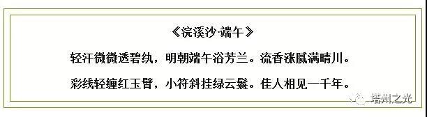 微 微 小 汗 濕 透 了 碧 色 的 細 絹 , 明 日 端 午 節 用 芳 蘭 草 沐 浴 。 流 香 酒 般 的 浴 水 、 油 膩 佈 滿 大 晴 的 江 面 。 五 彩 花 線 輕 輕 地 纏 在 紅 玉 色 手 臂 上 , 小 小 的 符 篆 ( 或 赤 靈 符 ) 斜 掛 在 耳 下 的 黑 色 髮 髻 上 。 與 朝 雲 同 過 端 午 節 , 天 長 地 久 , 白 頭 偕 老 。 這 首 詞 主 要 描 寫 婦 女 歡 度 端 午 佳 節 的 情 景 。 上 篇 描 述 她 們 節 日 前 進 行 的 各 種 準 備 , 下 篇 刻 畫 她 們 按 照 民 間 風 俗 , 彩 線 纏 玉 臂 , 小 符 掛 雲 鬟 , 互 致 節 日 的 祝 賀 。 全 詞 是 篇 民 俗 詩 , 充 滿 了 濃 郁 的 古 老 民 俗 氣 息 , 是 研 究 端 午 民 俗 最 形 象 而 珍 貴 的 資 料 。 ![]()