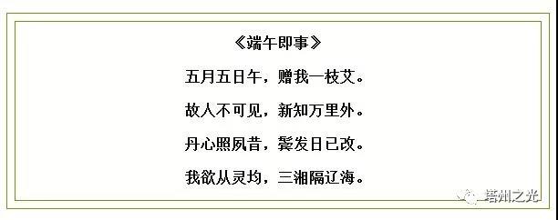 【 分 享 】 跟 著 古 詩 詞 , 來 一 場 端 午 節 「 穿 越 之 旅 」 新 華 網 塔 州 之 光 端 午 節 , 又 稱 端 陽 節 、 重 午 節 、 龍 日 、 龍 舟 節 、 正 陽 節 、 浴 蘭 節 、 天 中 節 等 等 , 與 春 節 、 清 明 節 、 中 秋 節 並 稱 為 中 國 民 間 四 大 傳 統 節 日 , 已 有 兩 千 多 年 的 歷 史 。 端 午 節 源 自 天 象 崇 拜 , 由 上 古 時 代 龍 圖 騰 祭 祀 演 變 而 來 。 端 午 節 的 起 源 涵 蓋 了 古 老 星 象 文 化 、 人 文 哲 學 等 方 面 內 容 , 蘊 含 著 深 邃 豐 厚 的 文 化 內 涵 , 也 在 傳 承 發 展 中 雜 糅 了 多 種 民 俗 , 比 如 吃 粽 子 , 賽 龍 舟 , 掛 艾 草 , 喝 雄 黃 酒 , 戴 香 包 等 等 。 這 些 節 俗 都 有 著 祈 福 、 消 災 等 主 題 , 寄 托 了 人 們 迎 祥 納 福 、 辟 邪 除 災 的 願 望 。 因 傳 說 愛 國 詩 人 屈 原 在 端 午 抱 石 跳 汨 羅 江 自 盡 , 後 來 人 們 亦 將 端 午 節 作 為 紀 念 屈 原 的 節 日 ; 也 有 紀 念 伍 子 胥 、 曹 娥 及 介 子 推 等 說 法 。 端 午 文 化 在 世 界 上 影 響 廣 泛 , 是 中 國 首 個 入 選 世 界 非 遺 的 節 日 。 在 品 粽 之 餘 , 我 們 不 妨 跟 著 古 人 的 詩 詞 , 來 一 場 「 穿 越 之 旅 」 , 一 窺 古 代 端 午 節 那 些 風 俗 。 ![]()