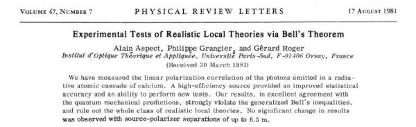 阿 蘭 • 阿 斯 佩 克 特 在 1981 年 發 表 的 實 驗 論 文 ( 來 源 : PRL )