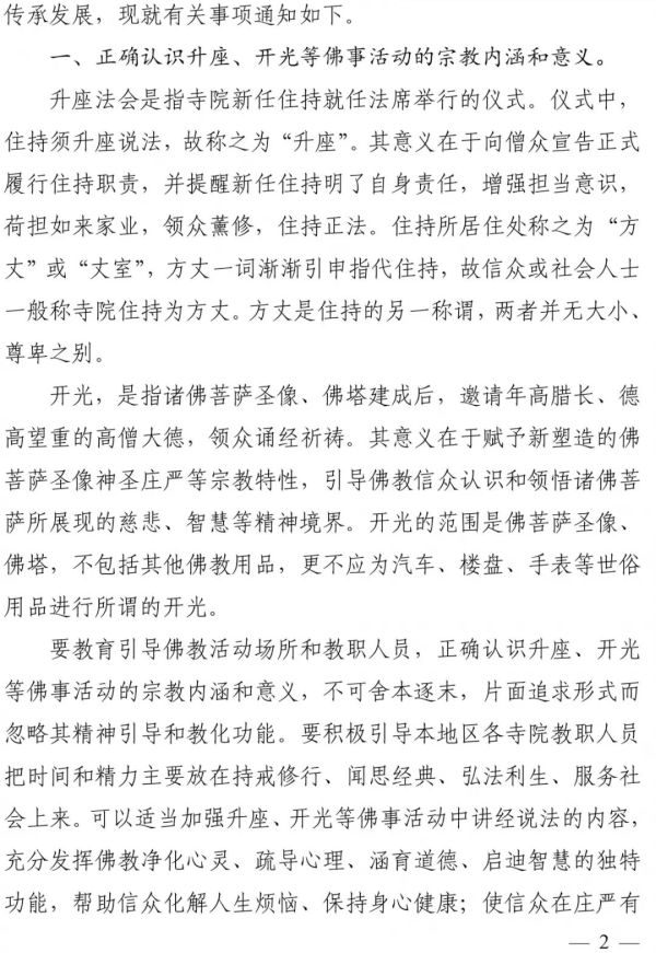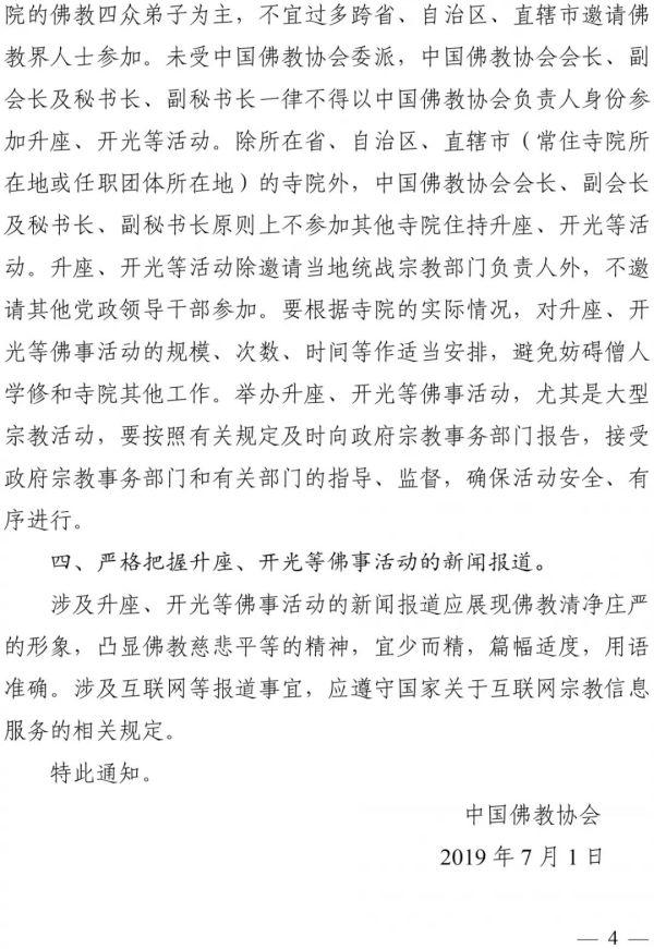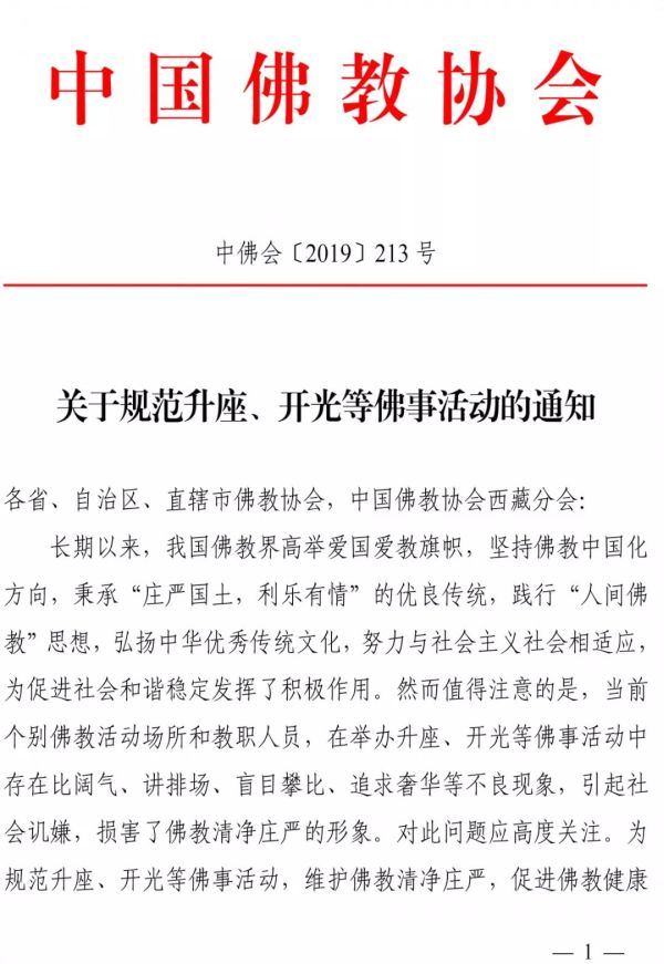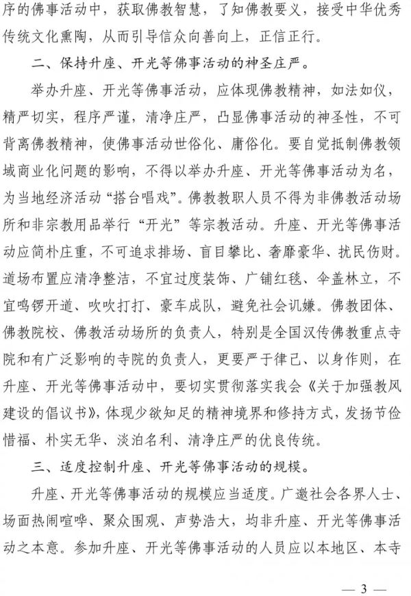 中 佛 會 ﹝ 2019 ﹞ 213 號 關 於 規 範 升 座 、 開 光 等 佛 事 活 動 的 通 知 長 期 以 來 , 我 國 佛 教 界 高 舉 愛 國 愛 教 旗 幟 , 堅 持 佛 教 中 國 化 方 向 , 秉 承 「 莊 嚴 國 土 , 利 樂 有 情 」 的 優 良 傳 統 , 踐 行 「 人 間 佛 教 」 思 想 , 弘 揚 中 華 優 秀 傳 統 文 化 , 努 力 與 社 會 主 義 社 會 相 適 應 , 為 促 進 社 會 和 諧 穩 定 發 揮 了 積 極 作 用 。 然 而 值 得 注 意 的 是 , 當 前 個 別 佛 教 活 動 場 所 和 教 職 人 員 , 在 舉 辦 升 座 、 開 光 等 佛 事 活 動 中 存 在 比 闊 氣 、 講 排 場 、 盲 目 攀 比 、 追 求 奢 華 等 不 良 現 象 , 引 起 社 會 譏 嫌 , 損 害 了 佛 教 清 淨 莊 嚴 的 形 象 。 對 此 問 題 應 高 度 關 注 。 為 規 範 升 座 、 開 光 等 佛 事 活 動 , 維 護 佛 教 清 淨 莊 嚴 , 促 進 佛 教 健 康 傳 承 發 展 , 現 就 有 關 事 項 通 知 如 下 。 一 、 正 確 認 識 升 座 、 開 光 等 佛 事 活 動 的 宗 教 內 涵 和 意 義 。 升 座 法 會 是 指 寺 院 新 任 住 持 就 任 法 席 舉 行 的 儀 式 。 儀 式 中 , 住 持 須 升 座 說 法 , 故 稱 之 為 「 升 座 」 。 其 意 義 在 於 向 僧 眾 宣 告 正 式 履 行 住 持 職 責 , 並 提 醒 新 任 住 持 明 瞭 自 身 責 任 , 增 強 擔 當 意 識 , 荷 擔 如 來 家 業 , 領 眾 薰 修 , 住 持 正 法 。 住 持 所 居 住 處 稱 之 為 「 方 丈 」 或 「 丈 室 」 , 方 丈 一 詞 漸 漸 引 申 指 代 住 持 , 故 信 眾 或 社 會 人 士 一 般 稱 寺 院 住 持 為 方 丈 。 方 丈 是 住 持 的 另 一 稱 謂 , 兩 者 並 無 大 小 、 尊 卑 之 別 。 開 光 , 是 指 諸 佛 菩 薩 聖 像 、 佛 塔 建 成 後 , 邀 請 年 高 臘 長 、 德 高 望 重 的 高 僧 大 德 , 領 眾 誦 經 祈 禱 。 其 意 義 在 於 賦 予 新 塑 造 的 佛 菩 薩 聖 像 神 聖 莊 嚴 等 宗 教 特 性 , 引 導 佛 教 信 眾 認 識 和 領 悟 諸 佛 菩 薩 所 展 現 的 慈 悲 、 智 慧 等 精 神 境 界 。 開 光 的 範 圍 是 佛 菩 薩 聖 像 、 佛 塔 , 不 包 括 其 他 佛 教 用 品 , 更 不 應 為 汽 車 、 樓 盤 、 手 錶 等 世 俗 用 品 進 行 所 謂 的 開 光 。 要 教 育 引 導 佛 教 活 動 場 所 和 教 職 人 員 , 正 確 認 識 升 座 、 開 光 等 佛 事 活 動 的 宗 教 內 涵 和 意 義 , 不 可 捨 本 逐 末 , 片 面 追 求 形 式 而 忽 略 其 精 神 引 導 和 教 化 功 能 。 要 積 極 引 導 本 地 區 各 寺 院 教 職 人 員 把 時 間 和 精 力 主 要 放 在 持 戒 修 行 、 聞 思 經 典 、 弘 法 利 生 、 服 務 社 會 上 來 。 可 以 適 當 加 強 升 座 、 開 光 等 佛 事 活 動 中 講 經 說 法 的 內 容 , 充 分 發 揮 佛 教 淨 化 心 靈 、 疏 導 心 理 、 涵 育 道 德 、 啟 迪 智 慧 的 獨 特 功 能 , 幫 助 信 眾 化 解 人 生 煩 惱 、 保 持 身 心 健 康 ; 使 信 眾 在 莊 嚴 有 序 的 佛 事 活 動 中 , 獲 取 佛 教 智 慧 , 了 知 佛 教 要 義 , 接 受 中 華 優 秀 傳 統 文 化 熏 陶 , 從 而 引 導 信 眾 向 善 向 上 , 正 信 正 行 。 二 、 保 持 升 座 、 開 光 等 佛 事 活 動 的 神 聖 莊 嚴 。 舉 辦 升 座 、 開 光 等 佛 事 活 動 , 應 體 現 佛 教 精 神 , 如 法 如 儀 , 精 嚴 切 實 , 程 序 嚴 謹 , 清 淨 莊 嚴 , 凸 顯 佛 事 活 動 的 神 聖 性 , 不 可 背 離 佛 教 精 神 , 使 佛 事 活 動 世 俗 化 、 庸 俗 化 。 要 自 覺 抵 制 佛 教 領 域 商 業 化 問 題 的 影 響 , 不 得 以 舉 辦 升 座 、 開 光 等 佛 事 活 動 為 名 , 為 當 地 經 濟 活 動 「 搭 台 唱 戲 」 。 佛 教 教 職 人 員 不 得 為 非 佛 教 活 動 場 所 和 非 宗 教 用 品 舉 行 「 開 光 」 等 宗 教 活 動 。 升 座 、 開 光 等 佛 事 活 動 應 簡 樸 莊 重 , 不 可 追 求 排 場 、 盲 目 攀 比 、 奢 靡 豪 華 、 擾 民 傷 財 。 道 場 佈 置 應 清 淨 整 潔 , 不 宜 過 度 裝 飾 、 廣 鋪 紅 毯 、 傘 蓋 林 立 , 不 宜 鳴 鑼 開 道 、 吹 吹 打 打 、 豪 車 成 隊 , 避 免 社 會 譏 嫌 。 佛 教 團 體 、 佛 教 院 校 、 佛 教 活 動 場 所 的 負 責 人 , 特 別 是 全 國 漢 傳 佛 教 重 點 寺 院 和 有 廣 泛 影 響 的 寺 院 的 負 責 人 , 更 要 嚴 於 律 己 、 以 身 作 則 , 在 升 座 、 開 光 等 佛 事 活 動 中 , 要 切 實 貫 徹 落 實 我 會 《 關 於 加 強 教 風 建 設 的 倡 議 書 》 , 體 現 少 欲 知 足 的 精 神 境 界 和 修 持 方 式 , 發 揚 節 儉 惜 福 、 樸 實 無 華 、 淡 泊 名 利 、 清 淨 莊 嚴 的 優 良 傳 統 。 三 、 適 度 控 制 升 座 、 開 光 等 佛 事 活 動 的 規 模 。 升 座 、 開 光 等 佛 事 活 動 的 規 模 應 當 適 度 。 廣 邀 社 會 各 界 人 士 、 場 面 熱 鬧 喧 嘩 、 聚 眾 圍 觀 、 聲 勢 浩 大 , 均 非 升 座 、 開 光 等 佛 事 活 動 之 本 意 。 參 加 升 座 、 開 光 等 佛 事 活 動 的 人 員 應 以 本 地 區 、 本 寺 院 的 佛 教 四 眾 弟 子 為 主 , 不 宜 過 多 跨 省 、 自 治 區 、 直 轄 市 邀 請 佛 教 界 人 士 參 加 。 未 受 中 國 佛 教 協 會 委 派 , 中 國 佛 教 協 會 會 長 、 副 會 長 及 秘 書 長 、 副 秘 書 長 一 律 不 得 以 中 國 佛 教 協 會 負 責 人 身 份 參 加 升 座 、 開 光 等 活 動 。 除 所 在 省 、 自 治 區 、 直 轄 市 ( 常 住 寺 院 所 在 地 或 任 職 團 體 所 在 地 ) 的 寺 院 外 , 中 國 佛 教 協 會 會 長 、 副 會 長 及 秘 書 長 、 副 秘 書 長 原 則 上 不 參 加 其 他 寺 院 住 持 升 座 、 開 光