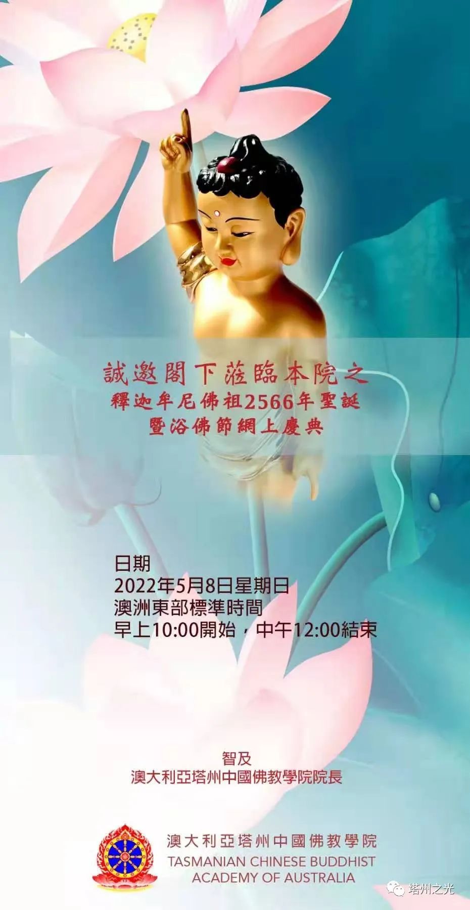 為與大眾分享 大聖 佛祖極終善性的慈悲和智慧、 大聖 佛祖聖誕的靈性喜悅,澳大利亞塔州中國佛教學院將於壬寅四月初八日,舉行慶祝 大聖 釋迦牟尼 佛祖二五六六年聖誕雲端浴佛聖典。持明密教傳統之大幻化天佛母誕太子諸天大樂紅雲聖儀、諸天如來降甘露金剛聖儀、帝釋天因陀羅網護摩聖儀、四天王庇佑聖儀等中國漢傳佛教密宗—聖密宗古梵密金剛禪佛教不共浴佛聖儀,移師網上雲端舉行,冀盼眾生體味明空自鑑無量諸三昧聖境,升起內心清淨,智慧增長,法喜充盈,解脫煩惱之大用。 詳情如下: