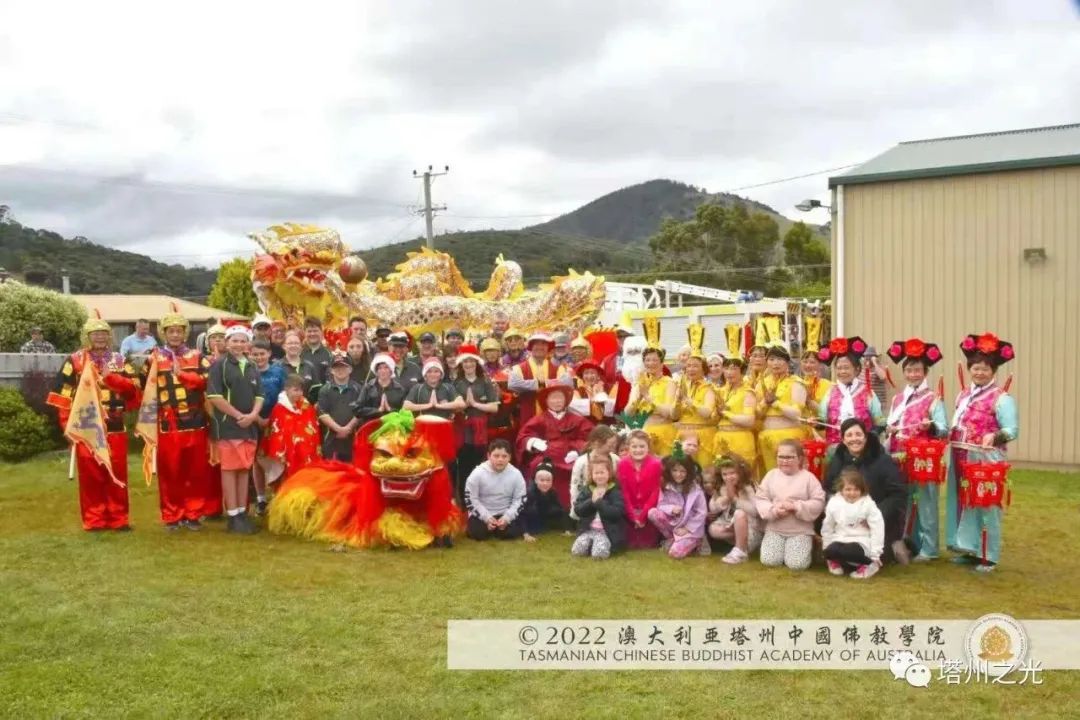 中國精神 自信自強 生機盎然 澳大利亞塔州中國佛教學院,在每年聖誕巡禮的聖密曼荼羅方陣,皆以聖密長老執持中國、澳洲國旗並肩同行,喻意佛學院以平穩踏實的腳步,緊隨母親的呼喚,顯微闡幽,義不容辭,積極推動中國精神靈性文化,邁出祖國文化自信,民族自豪,不卑不亢的步伐,實踐「內心謙下(是功),外行於禮(是德)」的普敬價值。 事實證明,不同文化的交流,能夠促進和諧,促進世界和平,促進世代友好發展。 在舉國歡慶的耶誕月,一週之內, 薄伽梵 智及維摩詰 師尊三度受塔州各市政府之邀參加年度慶祝活動,此三座衛星城鎮分別位於: