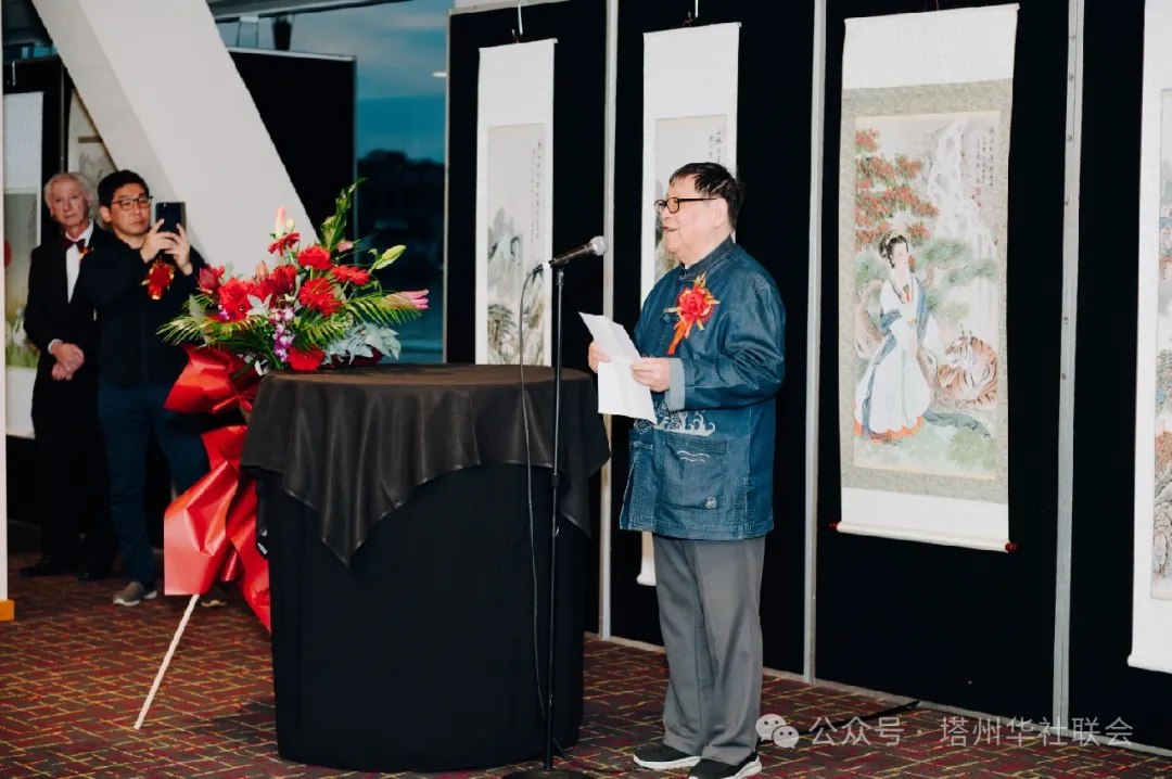 華聯會秘書長代表協會致辭歡迎到場的賓客們,徐哲秘書長引用當地說法,〝a picture worths a thousand words 〞一幅畫作勝過千言萬語,秦生老師不遠萬里帶來的上百幅書法畫作,用實際行動向世界展示中華傳統文化的深厚內涵,彰顯堅定的中華文化立場和文化自信;並向各位前來支援的表演團隊,佈展人員,社區志願者給予了認可和鳴謝,肯定了華人社區團結的力量可以戰勝任何挑戰,更呼應了塔州華聯會成立之初的宗旨〝和諧,團結,互助,共尊〞,積極促進中澳兩國人民友誼,推動中澳兩國經濟文化交流,協助華人融入當地主流社會。