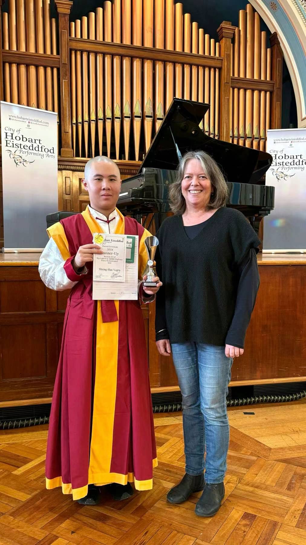 弟子感恩 薄伽梵 師尊爺爺對弟子的大加持和遮止,弟子在今年度的霍巴特鋼琴音樂節比賽中,榮獲17至18歲鋼琴獨奏專案第一名獎牌(Winner of the 17 & 18 Years Performance Solo Section )和澳洲考試局文憑級鋼琴獨奏專案第二名獎金(Runner Up-Australian Music Examinations Board Diploma Piano Performance Solo )。弟子今年的表現還算可以。在獲得第一名的專案當天,弟子參加了塔大音樂學院古典音樂系三重奏音樂會,弟子作為大學第一年學生,有機會和弟子的三重奏組在臺上演出。弟子和弟子的三重奏組合(分別是鋼琴、法國號和單簧管)表演了一位在古典音樂浪漫時期的德國男作曲家的作品,受到全場的熱情和掌聲支援。弟子很感恩金剛龍聖長老和紅淨長老兩位大長老出席了此次音樂會,看弟子的演出。弟子表演後回了法場準備片刻又馬上趕到音樂節比賽現場參賽。