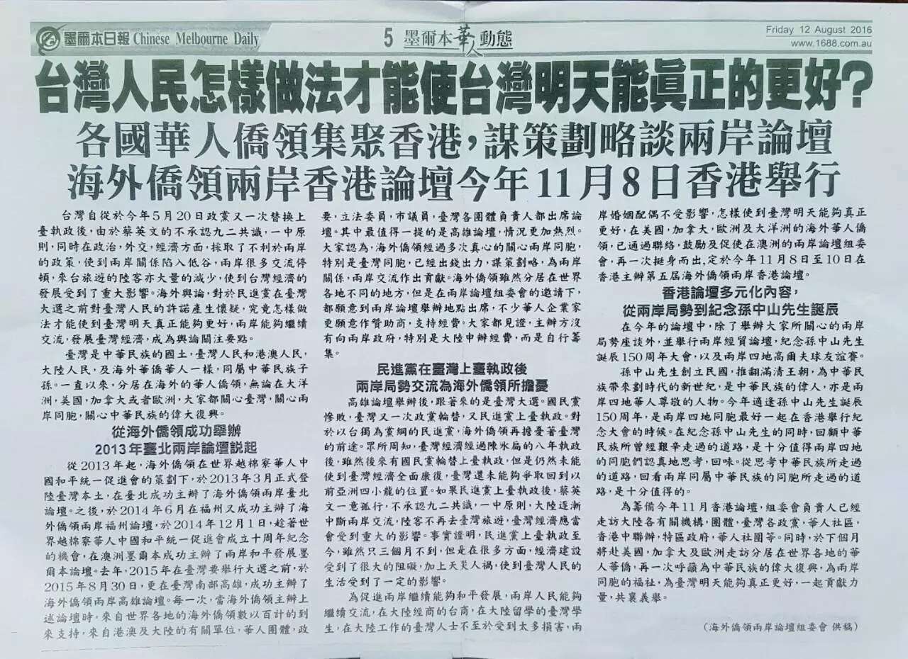 台 灣 人 民 怎 樣 做 才 能 使 台 灣 明 天 能 更 好 ? 各 國 華 人 僑 領 集 聚 香 港 , 謀 策 劃 略 談 兩 岸 論 壇 , 海 外 僑 領 兩 岸 香 港 論 壇 今 年 11 月 6 日 ~ 8 日 香 港 舉 行