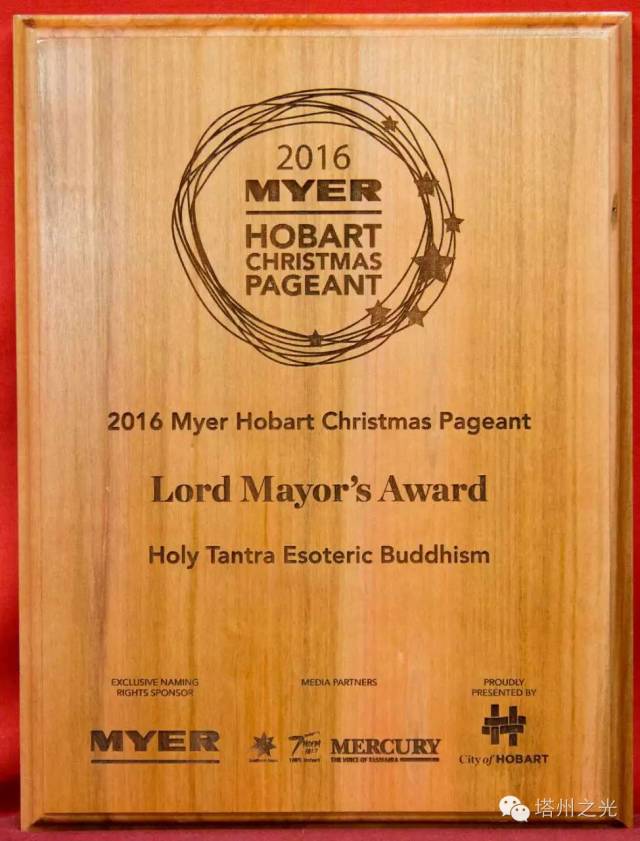 HOBART 市 市 長 Sue Hickey 在 她 的 臉 書 上 , 刊 登 了 澳 大 利 亞 塔 州 中 國 佛 教 學 院 在 市 政 廳 榮 獲 「 2016 HOBART 聖 誕 遊 行 市 長 特 別 獎 」 的 照 片 , 以 表 彰 和 感 謝 塔 州 中 國 佛 教 學 院 參 與 此 次 聖 誕 遊 行 中 表 達 的 濃 郁 豐 富 的 中 國 文 化 特 色 。