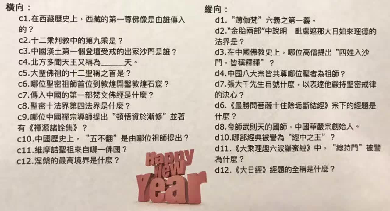 此 刻 塔 州 中 國 佛 學 院 正 在 與 本 地 英 語 學 員 , 共 同 召 開 告 別 2016 , 迎 接 2017 的 新 年 晚 會 , 各 種 遊 戲 開 始 。 圖 為 填 字 遊 戲 , 歡 迎 全 球 聖 密 行 者 一 起 參 加 。