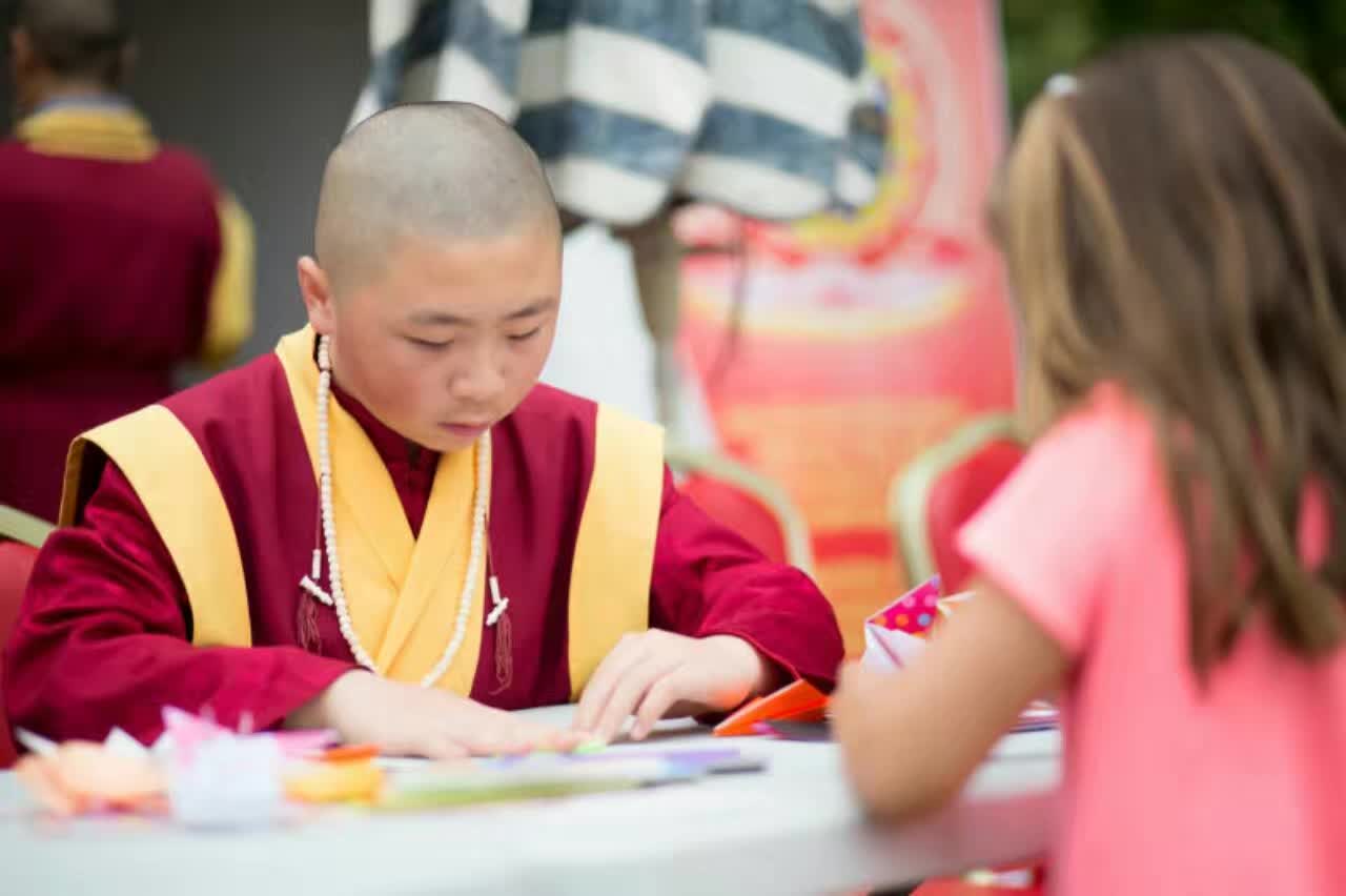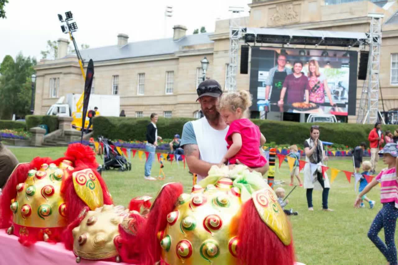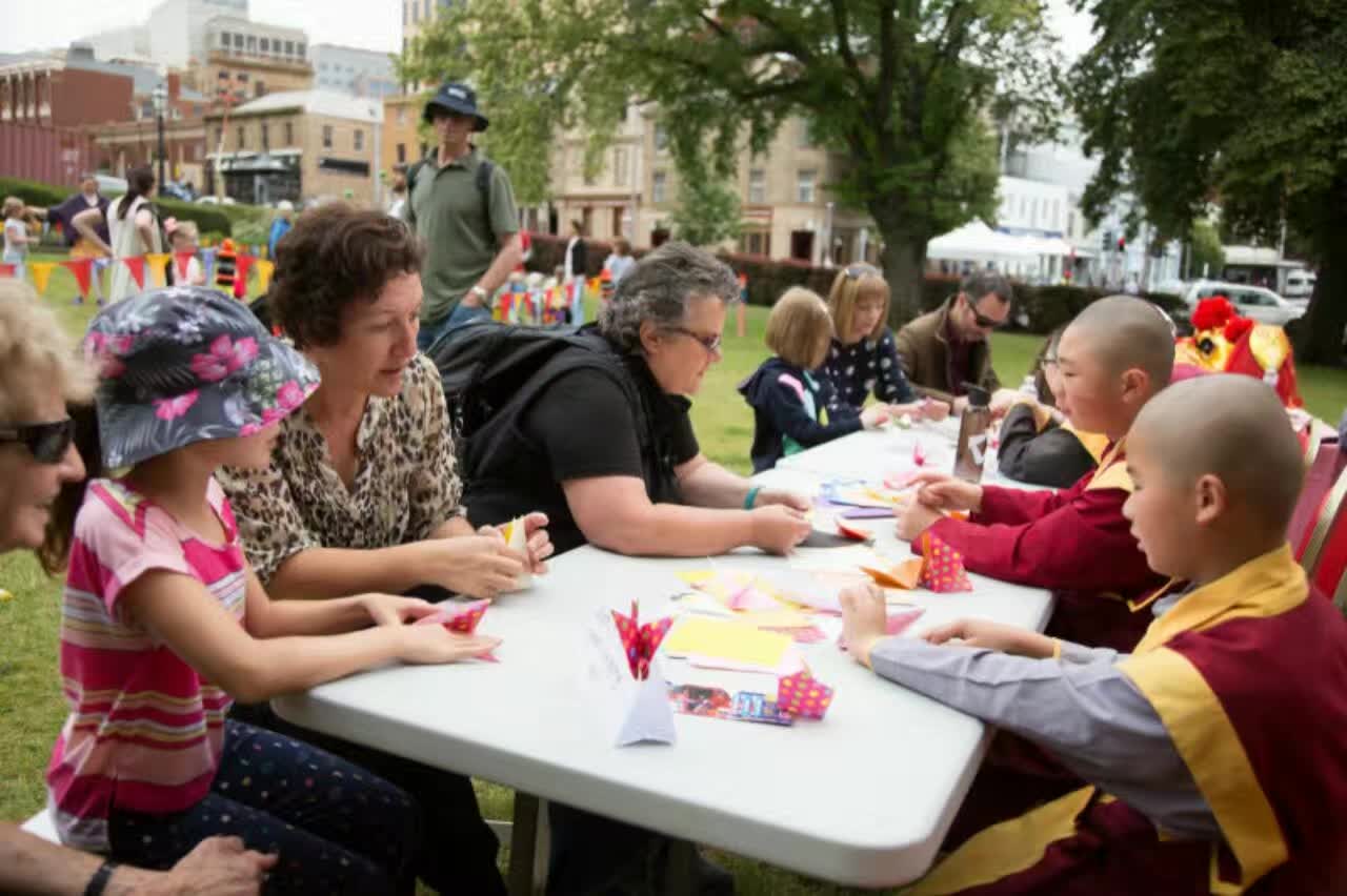 在 2017 年 元 旦 日 , 澳 大 利 亞 塔 州 中 國 佛 教 學 院 再 次 被 邀 請 在 一 年 一 度 於 霍 巴 特 舉 行 的 美 食 節 〝 兒 童 在 公 園 〞 的 活 動 中 , 作 遊 戲 亭 的 主 持 及 表 演 。 佛 教 學 院 的 遊 戲 亭 為 兒 童 指 導 摺 紙 , 亦 以 他 們 的 英 文 名 字 的 拼 音 , 替 他 們 做 一 個 中 文 譯 音 的 書 籤 , 同 時 也 讓 孩 童 們 試 戴 聖 密 金 剛 舞 的 獅 頭 , 為 眾 生 提 供 對 學 院 進 一 步 認 識 的 因 緣 , 也 令 他 們 對 中 國 文 化 有 初 步 認 識 的 機 會 。 如 去 年 一 樣 , 受 到 兒 童 及 他 們 家 人 們 的 熱 烈 支 持 和 喜 愛 。