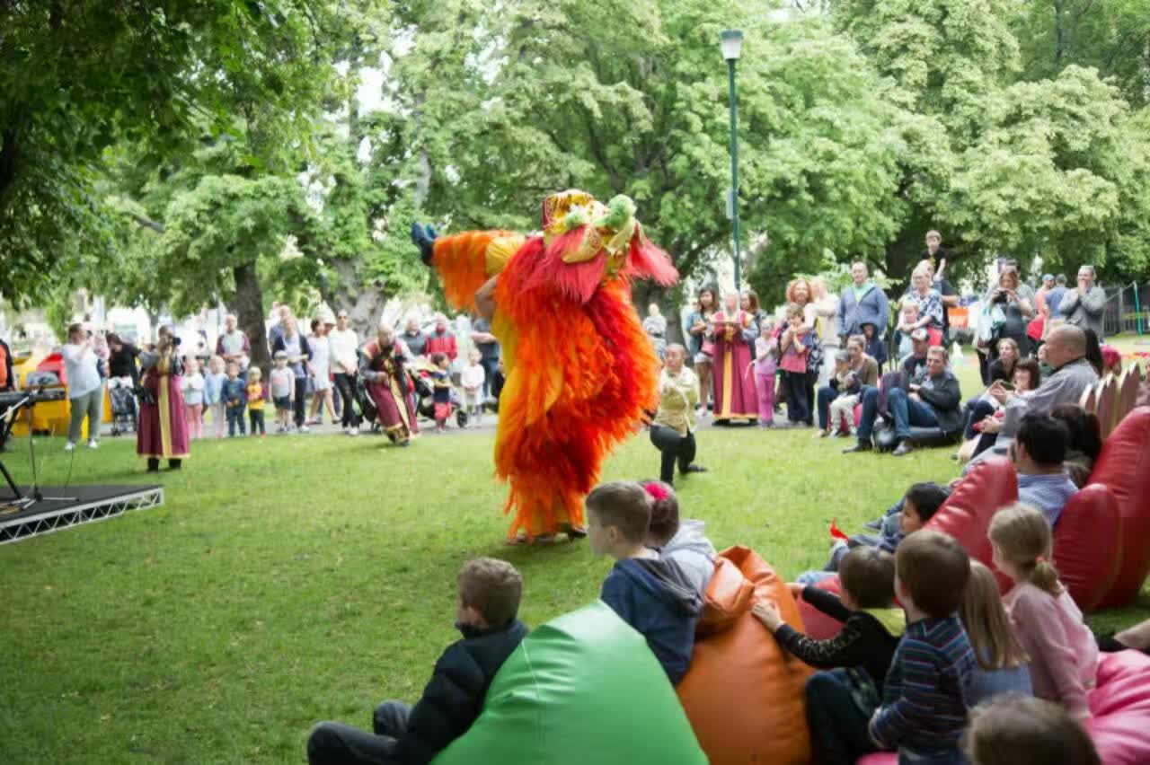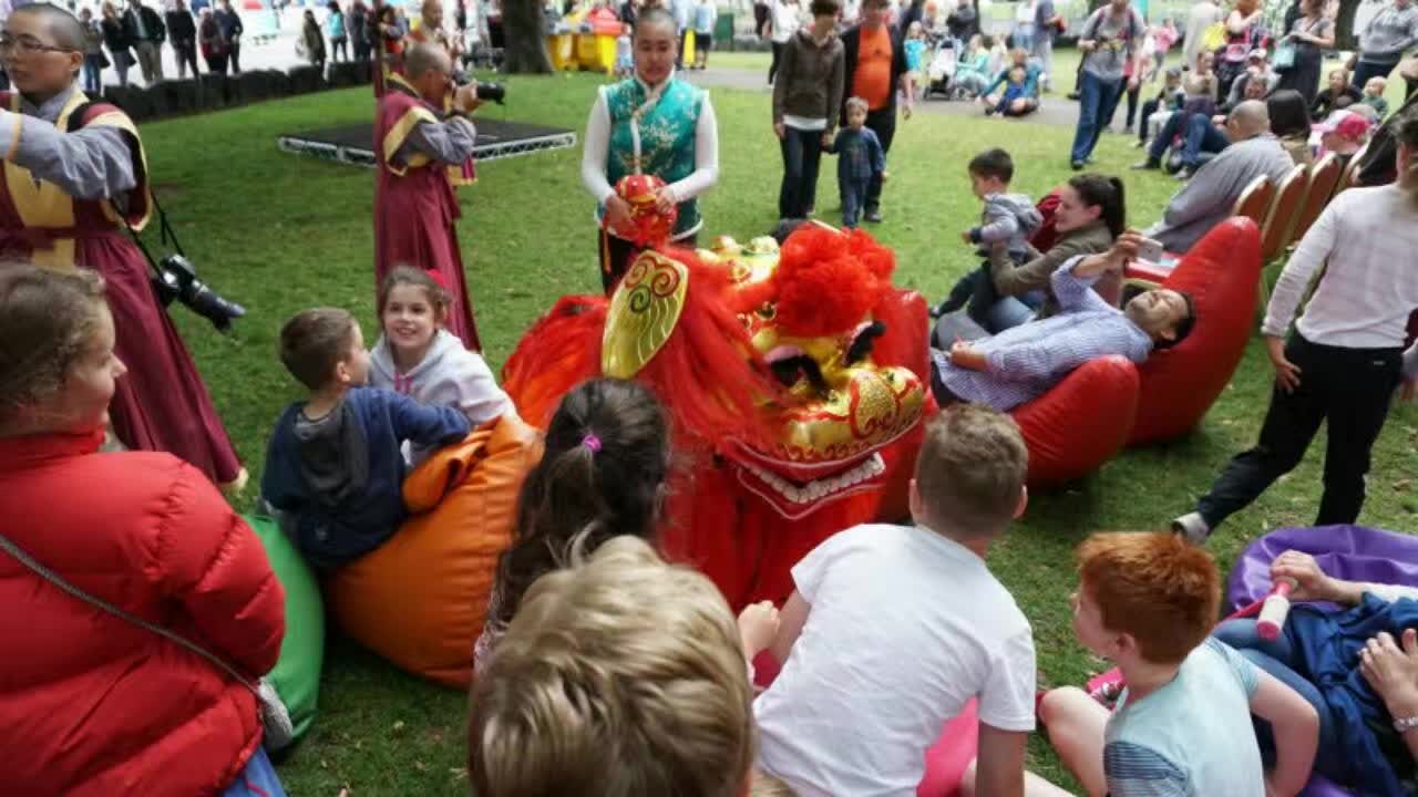 在 2017 年 元 旦 日 , 澳 大 利 亞 塔 州 中 國 佛 教 學 院 再 次 被 邀 請 在 一 年 一 度 於 霍 巴 特 舉 行 的 美 食 節 〝 兒 童 在 公 園 〞 的 活 動 中 , 作 遊 戲 亭 的 主 持 及 表 演 。 佛 教 學 院 的 遊 戲 亭 為 兒 童 指 導 摺 紙 , 亦 以 他 們 的 英 文 名 字 的 拼 音 , 替 他 們 做 一 個 中 文 譯 音 的 書 籤 , 同 時 也 讓 孩 童 們 試 戴 聖 密 金 剛 舞 的 獅 頭 , 為 眾 生 提 供 對 學 院 進 一 步 認 識 的 因 緣 , 也 令 他 們 對 中 國 文 化 有 初 步 認 識 的 機 會 。 如 去 年 一 樣 , 受 到 兒 童 及 他 們 家 人 們 的 熱 烈 支 持 和 喜 愛 。