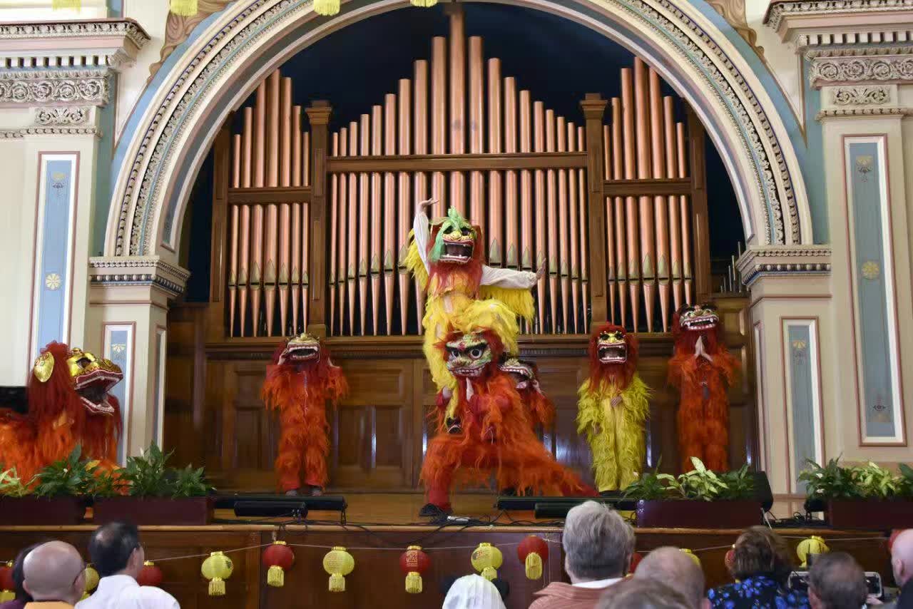 在 眾 多 的 文 藝 表 演 中 , 有 逗 人 喜 愛 的 幼 兒 舞 蹈 隊 的 燈 籠 舞 和 新 疆 舞 、 難 得 一 見 的 北 京 京 腔 獨 唱 、 古 典 長 袖 舞 、 澳 洲 本 地 歌 唱 團 演 唱 《 木 蘭 》 、 閩 南 舞 、 金 剛 聖 源 和 另 一 位 多 才 多 藝 的 年 青 音 樂 家 的 《 四 手 連 奏 保 衛 黃 河 》 、 中 西 樂 器 五 重 奏 ( 男 女 古 箏 、 鋼 琴 、 笛 、 小 提 琴 ) 彩 雲 追 月 , 婀 娜 多 姿 的 朝 鮮 舞 、 及 武 術 表 演 ( 南 拳 、 雙 刀 、 刁 首 、 劍 、 棍 、 雙 棍 對 打 等 ) , 均 獲 得 全 場 觀 場 一 幕 又 一 幕 的 熱 烈 掌 聲 。
