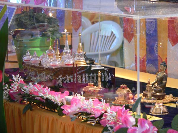 神 聖 的 大 聖 釋 迦 牟 尼 佛 祖 生 身 舍 利 被 恭 奉 在 佛 陀 寺 佛 殿 正 中 。