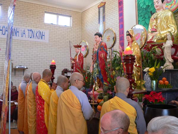 釋 善 友 法 師 帶 領 六 位 越 南 佛 教 女 尼 在 佛 像 前 禮 敬 , 並 行 讚 頌 。