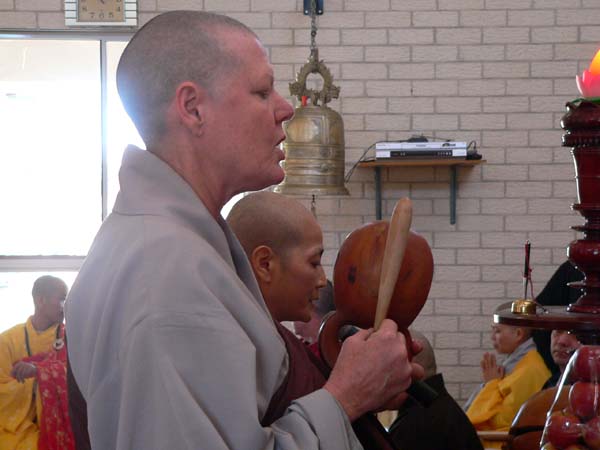 韓 國 佛 教 女 尼 在 開 幕 式 上 稱 名 唸 佛 。