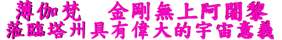 薄 伽 梵 七 佛 之 師 曼 殊 師 利 佛 大 聖 寶 金 剛 無 上 阿 闍 黎 上 白 下 雲 老 禪 師 蒞 臨 塔 州 , 親 自 佈 設 薄 伽 梵 108 億 因 陀 羅 網 具 有 偉 大 的 宇 宙 意 義 , 從 地 球 北 方 到 南 方 親 自 佈 發 聖 密 宗 古 梵 密 全 球 無 相 大 護 摩 的 偉 大 創 舉 具 有 偉 大 的 宇 宙 意 義 。 |