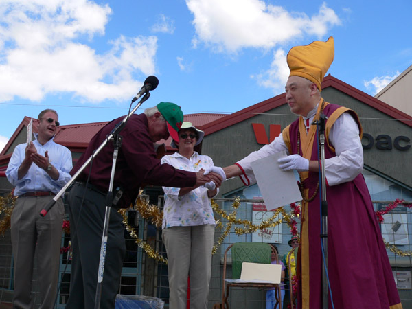 “ 我 們 的 到 訪 不 是 為 了 獲 取 , 我 們 是 為 奉 獻 而 來 ! ” ── 金 剛 永 樂 長 老 代 表 聖 密 宗 金 剛 禪 佛 教 從 Cr Peter Partridge 手 中 接 過 獎 狀 , 同 時 將 一 百 元 獎 金 回 饋 給 Dorset 市 民 。 從 左 至 右 : 塔 州 眾 議 員 Mr. Peter Gutwein 、 Cr Peter Partridge 、 塔 州 眾 議 員 Ms Sue Napier 和 金 剛 永 樂 長 老 。 |