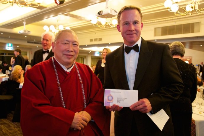 作 為 今 年 在 蘇 格 蘭 舉 行 的 第 二 十 屆 英 聯 邦 運 動 會 舉 行 之 前 奏 , 同 時 為 澳 洲 運 動 員 在 出 發 前 予 最 後 一 注 的 經 濟 支 持 和 鼓 勵 , 適 逢 3 月 全 州 大 選 , 塔 州 選 出 了 新 一 任 州 長 , 英 聯 邦 運 動 會 澳 洲 籌 委 會 塔 州 分 部 於 5 月 24 日 隆 重 舉 行 塔 州 州 長 籌 款 晚 宴 , 並 邀 請 薄 伽 梵 智 及 維 摩 詰 師 尊 出 席 。