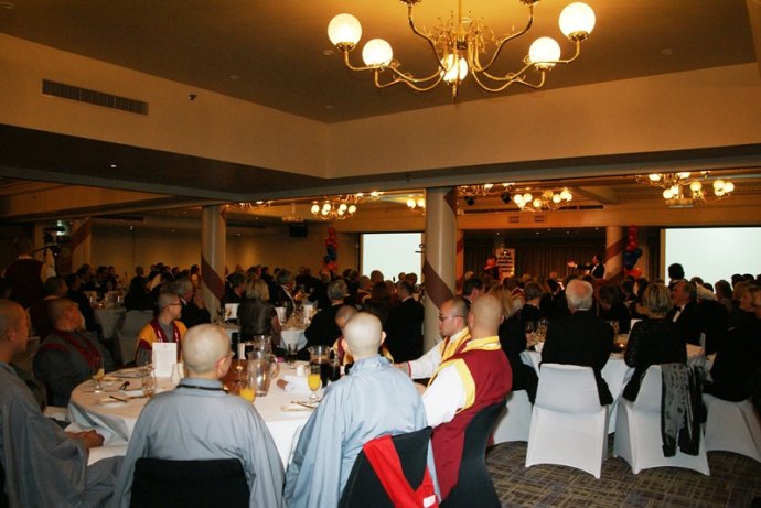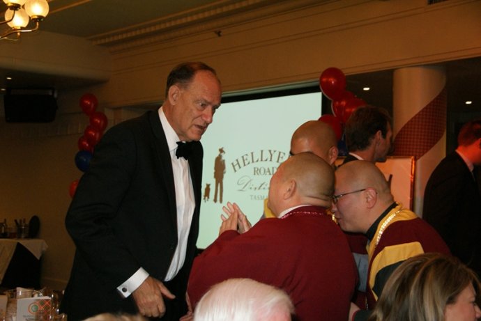 宴 會 中 , 無 論 是 主 持 人 還 是 塔 州 分 部 籌 委 主 席 The Honourable Rob Valentine MLC , 都 多 次 向 全 場 來 賓 介 紹 薄 伽 梵 智 及 維 摩 詰 師 尊 , 並 高 度 評 價 薄 伽 梵 智 及 維 摩 詰 師 尊 對 澳 洲 參 與 這 些 國 際 體 育 盛 事 的 經 濟 上 和 精 神 靈 性 上 的 支 持 。 薄 伽 梵 智 及 維 摩 詰 師 尊 從 坐 位 上 站 起 , 向 全 場 四 方 謙 恭 合 十 , 行 持 聖 密 迴 向 密 印 , 為 全 場 眾 生 作 無 相 聖 密 灌 頂 。 一 時 間 , 聖 密 虹 光 熠 現 , 靈 性 醍 醐 遍 灑 , 諸 天 諸 佛 臨 壇 加 持 ; 在 此 塔 州 五 月 份 隆 冬 之 際 , 整 個 會 場 尤 似 得 惠 風 和 暢 , 冬 日 溫 暖 , 全 場 都 即 時 以 熱 烈 的 掌 聲 回 報 。