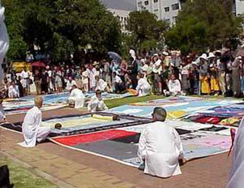 1 9 9 9 世 界 宗 教 國 會 會 議 開 幕 那 天 , 全 世 界 各 個 宗 教 的 代 表 團 、 出 席 者 們 出 發 遊 行 之 前 , 齊 集 在 開 普 頓 市 中 一 公 園 內 , 大 會 安 排 了 一 為 愛 滋 病 舉 行 的 〝 攤 開 棉 被 〞 儀 式 。