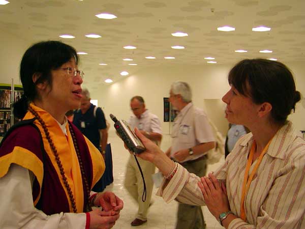 把 大 聖 釋 迦 牟 尼 佛 極 終 善 性 的 慈 悲 和 智 慧 安 住 於 眾 生 心 間 ── 金 剛 禪 彰 長 老 接 受 The World Peace Flame ( 世 界 和 平 火 焰 ) 的 英 國 女 會 員 Ms. Julie Mokhleiss 訪 問 。