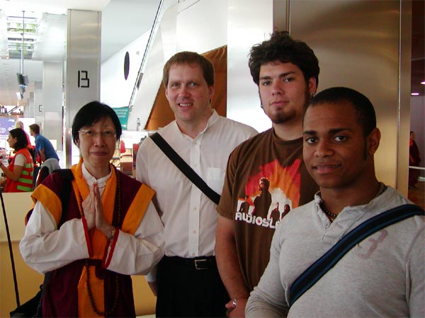 聖 密 僧 伽 以 慈 、 悲 、 喜 、 捨 的 精 神 , 入 世 攝 受 眾 生 。 圖 為 金 剛 禪 彰 長 老 與 三 位 巴 塞 隆 拿 的 年 輕 人 合 影 留 念 。