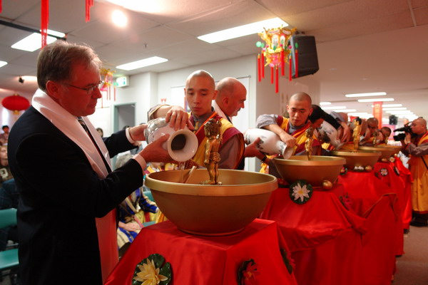 貴 賓 們 被 邀 請 代 表 諸 天 諸 佛 降 下 醍 醐 甘 露 , 沐 浴 初 生 的 悉 達 多 太 子 。