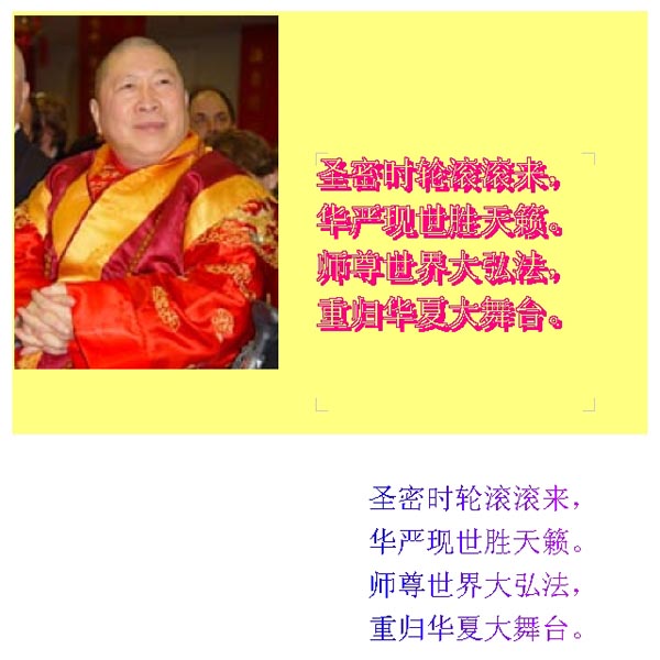 敬 愛 的 您 好 ! 弟 子 非 常 感 恩 您 轉 動 聖 密 時 輪 , 將 祖 國 的 瑰 寶 帶 回 華 夏 , 重 歸 故 里 。 華 嚴 聖 緣 給 弟 子 無 量 的 加 持 。