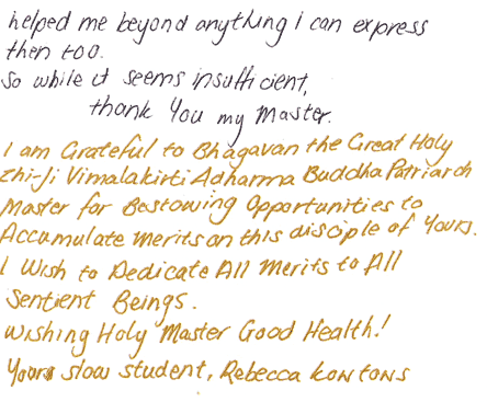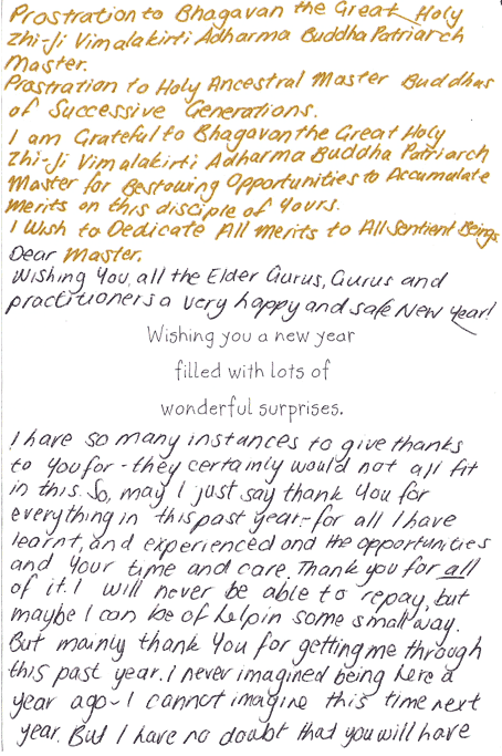 親 愛 的 祝 願 您 , 所 有 長 老 們 、 上 師 們 及 行 者 們 一 個 非 常 快 樂 及 安 全 的 新 年 。 我 有 那 麼 多 的 事 情 要 感 謝 您 的 - 這 裡 肯 定 放 不 下 它 們 。 所 以 , 我 可 否 只 說 感 謝 您 過 去 這 一 年 的 一 切 - 所 有 我 學 到 的 、 經 歷 的 、 被 給 予 的 諸 機 會 和 您 的 時 間 及 照 顧 。 感 謝 您 所 有 一 切 。 我 將 永 不 能 回 報 , 但 或 者 可 以 通 過 一 些 小 的 方 式 幫 忙 。 但 主 要 感 謝 您 幫 我 過 了 這 一 年 。 我 一 年 前 從 沒 想 像 到 在 這 裡 , 我 不 能 想 像 明 年 這 個 時 候 。 但 我 沒 有 懷 疑 您 也 將 會 幫 助 我 超 越 任 何 我 可 以 表 達 到 的 事 情 。 所 以 , 儘 管 它 看 來 是 不 足 夠 的 ,