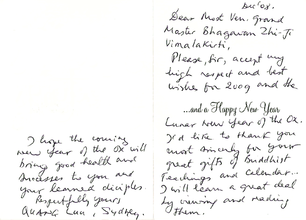 親 愛 的 最 神 聖 的 大 師 薄 伽 梵 智 及 維 摩 詰 : 請 , 大 師 , 接 受 我 高 的 尊 敬 及 2009 年 及 牛 年 陰 曆 新 年 最 佳 的 祝 願 。 我 希 望 最 誠 懇 的 感 謝 您 的 佛 教 教 授 和 年 曆 等 的 重 要 的 禮 物 。 我 觀 看 及 閱 讀 它 們 將 會 學 到 非 常 多 。 我 希 望 即 將 來 臨 的 牛 年 新 年 將 帶 良 好 的 健 康 及 成 功 給 您 和 您 的 博 學 的 信 徒 們 。 您 尊 敬 的