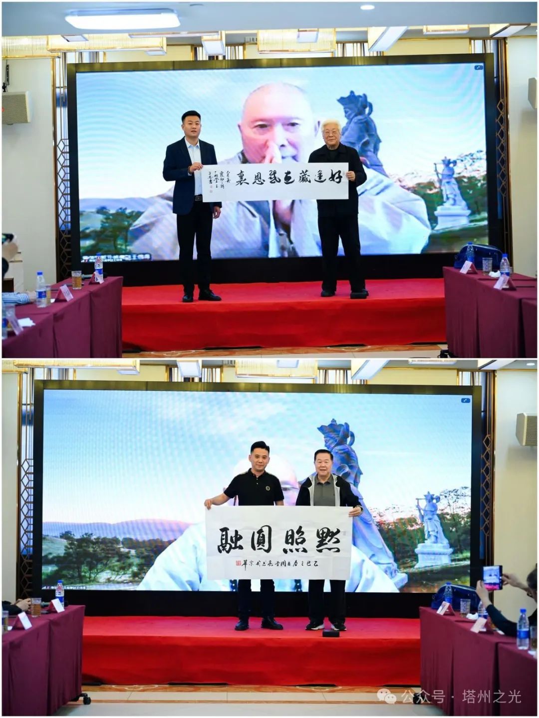 ![]() 会议期间,中国书画家联谊会王子忠主席、国务院机关事务管理局原巡视员周晋亮分别向主办方赠送了题为〝好运藏在感恩里〞、〝默照圆融〞的墨宝,用艺术诠释了文化交融的理念,为活动增添了浓厚的文化氛围。