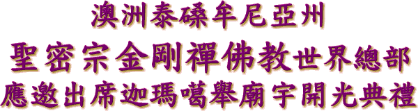 這 個 廟 宇 的 成 立 , 是 Tasmania 的 一 件 大 事 。 漢 、 藏 兩 傳 的 聯 合 儀 規 , 祂 標 誌 著 塔 州 佛 教 的 重 大 進 步 , 標 誌 著 中 國 漢 傳 密 宗 和 藏 傳 密 宗 的 團 結 、 聯 合 和 預 示 著 美 好 的 未 來 。 我 們 相 互 學 習 的 地 方 很 多 。 把 這 人 類 文 明 的 靈 性 精 粹 , 在 我 們 共 同 的 努 力 之 下 , 將 我 佛 極 終 善 性 的 慈 悲 和 智 慧 , 迴 向 所 有 的 眾 生 。