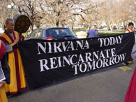 圖 為 : 聖 密 僧 伽 們 在 國 會 大 廈 門 前 Salamanca 公 園 , 持 著 黑 色 的 橫 幅 。 恭 奉 著 聖 密 法 器 : 瓔 珞 聖 鼓 , 安 靜 而 迅 速 地 準 備 著 聖 密 儀 規 和 悼 念 程 序 的 一 切 。