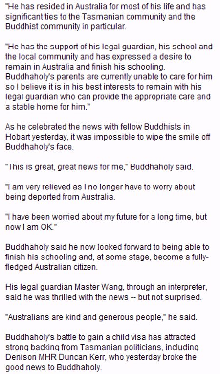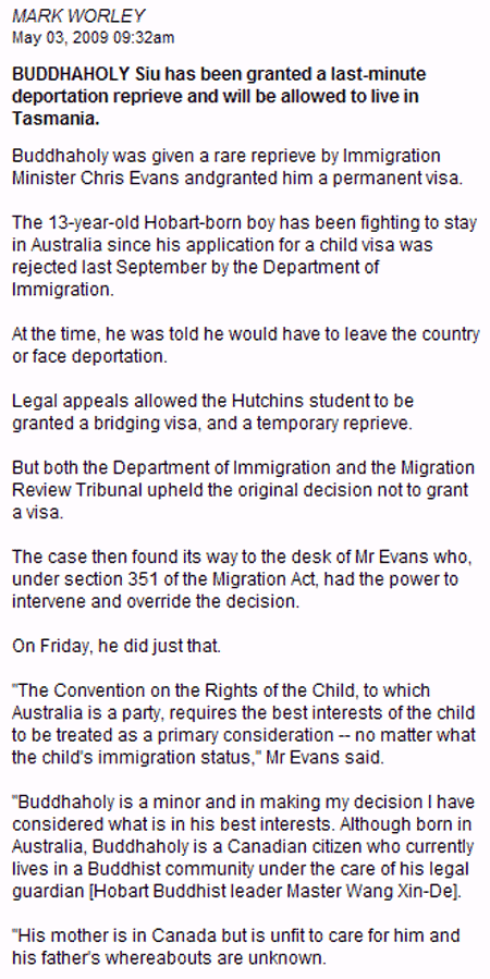 《 水 銀 報 》 記 者 Mark Worley 撰 寫 2009 年 5 月 3 日 上 午 9:32 蕭 佛 聖 已 經 被 賜 予 一 個 最 後 的 放 逐 豁 免 , 並 將 會 被 准 予 住 在 塔 州 。 佛 聖 被 移 民 部 長 Chris Evans 給 予 一 個 罕 見 的 豁 免 , 並 賜 予 他 一 個 長 期 簽 証 。 自 從 這 十 三 歲 Hobart 出 生 的 男 孩 在 去 年 九 月 被 移 民 部 拒 絕 他 的 兒 童 簽 証 申 請 後 , 他 一 直 為 了 居 留 在 澳 洲 而 鬥 爭 。 當 時 他 被 告 訴 他 要 離 開 國 家 或 者 面 臨 放 逐 出 境 。 法 律 的 上 訴 准 許 了 這 Hutchins 學 生 被 給 予 過 橋 簽 証 和 一 個 暫 時 豁 免 。 但 移 民 局 和 移 民 回 顧 審 判 庭 都 支 持 原 有 的 決 定 不 給 予 簽 証 。 此 案 件 最 後 來 到 Evans 先 生 的 桌 子 , 他 以 《 移 居 法 案 》 第 351 部 的 權 力 干 涉 和 撤 銷 這 決 定 。 在 星 期 五 , 他 就 這 樣 做 了 。 “ 澳 洲 是 《 兒 童 權 益 公 約 》 的 一 份 子 , 此 公 約 要 求 我 們 視 兒 童 的 利 益 為 重 要 並 作 為 一 個 首 要 的 考 慮 ── 無 論 該 兒 童 的 移 民 狀 態 是 怎 麼 樣 , ” Evans 先 生 說 。 “ 佛 聖 是 一 個 未 成 年 人 , 我 在 作 此 決 定 時 , 我 考 慮 的 是 他 的 最 佳 利 益 。 雖 然 是 出 生 於 澳 洲 , 佛 聖 是 一 個 加 拿 大 公 民 , 現 在 則 住 在 佛 教 社 團 裡 , 在 他 的 法 律 監 護 人 〔 Hobart 佛 教 領 袖 王 信 得 大 師 〕 之 下 獲 得 照 顧 。 ” “ 他 的 生 命 中 大 部 份 時 間 是 住 在 澳 洲 , 並 且 , 與 塔 州 社 團 有 重 要 的 聯 繫 , 特 別 是 佛 教 社 團 。 ” 他 擁 有 他 的 法 律 監 護 人 、 他 的 學 校 和 當 地 社 團 的 支 持 , 而 他 本 人 也 表 達 了 逗 留 在 澳 洲 和 完 成 他 的 學 業 的 欲 望 。 佛 聖 的 父 母 現 在 不 能 照 顧 他 , 所 以 我 相 信 與 他 的 法 律 監 護 人 在 一 起 , 對 他 是 最 好 的 利 益 , 法 律 監 護 人 能 夠 提 供 合 適 的 照 顧 和 一 個 穩 定 的 家 給 他 。 當 他 與 他 的 佛 教 徒 同 伴 在 Hobart 慶 祝 這 消 息 時 , 很 困 難 抹 走 佛 聖 臉 上 的 笑 容 。 “ 這 對 我 來 是 最 好 、 最 好 的 消 息 , ” 佛 聖 說 。 “ 我 現 在 是 非 常 放 心 , 因 為 我 不 再 要 擔 心 被 澳 洲 放 逐 出 境 。 ” “ 很 長 的 一 段 時 間 了 , 我 一 直 在 擔 心 我 的 未 來 , 但 現 在 我 沒 事 了 。 ” 佛 聖 說 他 現 在 盼 望 完 成 他 的 學 業 , 並 且 , 在 某 一 階 段 時 , 成 為 一 位 羽 毛 豐 滿 會 飛 的 澳 洲 公 民 。 他 的 法 律 監 護 人 王 大 師 , 通 過 翻 譯 員 , 說 祂 聽 見 此 消 息 是 極 為 激 動 ── 但 不 意 外 。 “ 澳 洲 人 是 仁 慈 和 慷 慨 的 人 們 , ” 祂 說 。 佛 聖 獲 取 兒 童 簽 証 的 鬥 爭 吸 引 塔 州 政 治 家 的 強 大 的 支 持 , 包 括 Denison 眾 議 院 議 員 Duncan Kerr , 昨 天 向 佛 聖 透 露 宣 佈 這 好 消 息 。 |